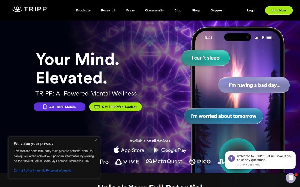 TRIPP 是一个以“Your Mind. Elevated.”为口号的AI 驱动身心健康平台,提供移动端与头显(VR)等多端体验。官网强调通过沉浸式视觉、声音与引导内容,帮助用户在日常中获得片刻平静、管理情绪并建立健康习惯。平台展示了大量用户评价与使用数据(如 11M+ 全球健康会话、数百万次五星评分与下载),并提供按年计费的订阅计划以解锁完整体验。