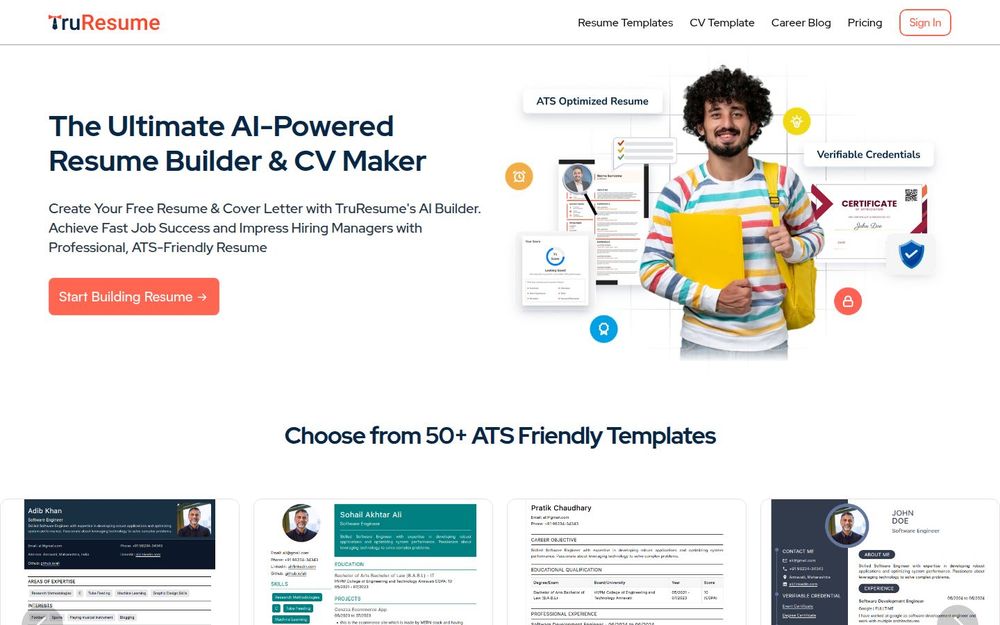 TruResume 是一款面向求职者的 AI 驱动简历与求职信生成平台,致力于快速生成专业且 ATS 友好的简历,帮助用户提升面试机会并给招聘方留下良好第一印象。平台结合模板库、AI 文案优化、自动化评分与区块链凭证等功能,提供从简历撰写到格式导出的完整流程。界面强调易用性,支持多种导出格式与移动端应用,适合不同阶段和行业的求职者使用。