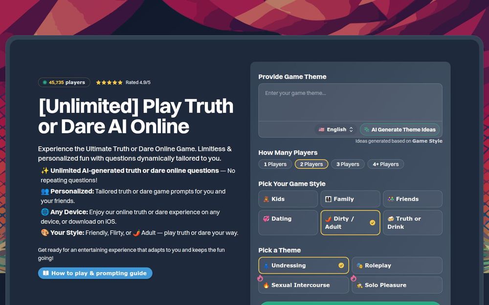 Truth or Dare AI(真心话大冒险 AI)是一个将经典派对游戏与现代人工智能结合的在线平台,旨在为聚会、约会或个人娱乐提供持续不断、风格多样的真心话与大冒险题目。网站界面简单、可即时访问,同时提供 iOS 应用,方便随时随地展开游戏。创作者为个人开发者 Aleksander,平台还配套博客与社区以分享玩法技巧与创意主题。