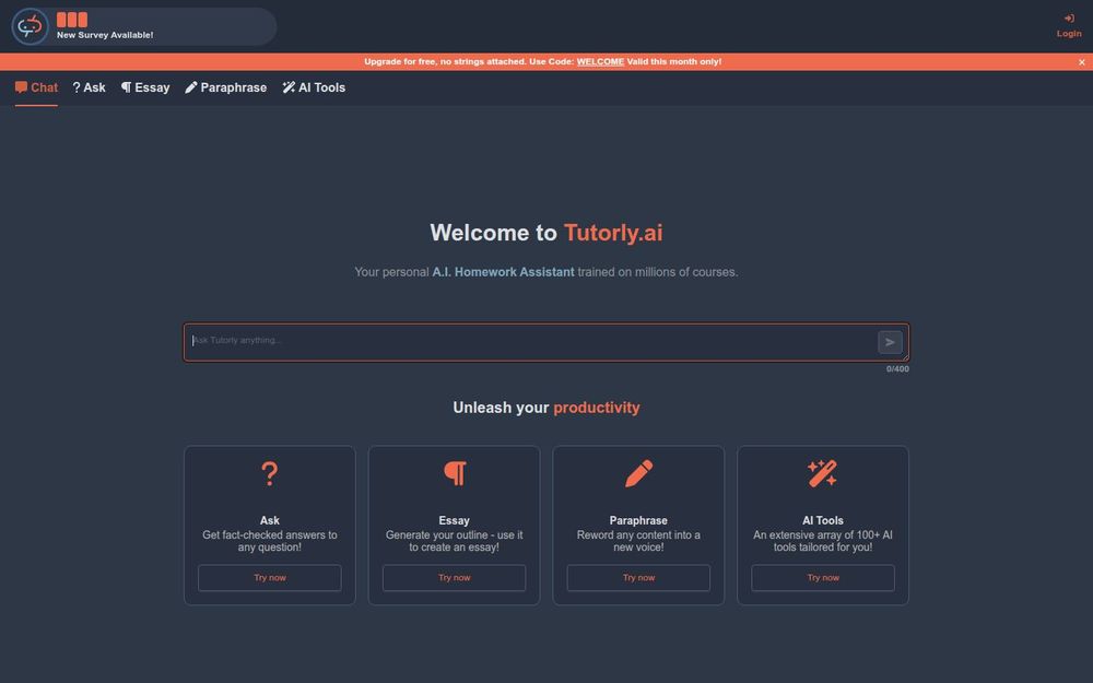 Tutorly 是一款面向学生和自学者的在线 A.I. 作业助手,声称基于海量课程训练,提供随时可用的学术支持。平台以简洁的界面把 即时聊天(Chat)、问答(Ask)、论文写作(Essay)、改写润色(Paraphrase) 以及 100+ AI 工具(AI Tools) 集成在一起,旨在帮助用户从构思到最终稿件都能高效完成。