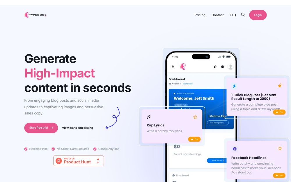 Typeboss 是一款以 AI 为核心的内容生成平台,旨在帮助用户快速、规模化地产出高质量、可发布的内容。它结合了模板驱动的写作流程、智能编辑工具和多模态生成功能,适用于写博客、社媒内容、营销文案、图片与音频制作等多种场景。平台强调易用性与可扩展性,并提供免费试用与多种定价选项,满足从个人创作者到企业团队的不同需求。