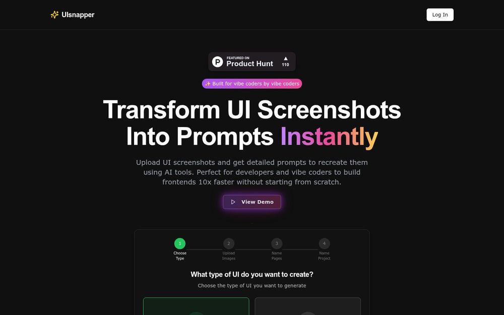 UIsnapper 是一款专为 UI 开发与界面复刻设计的工具,标语为“Built for vibe coders by vibe coders”。它通过将 UI 截图转化为结构化的 AI 提示,帮助开发者在短时间内重现视觉设计与前端结构,适合需要快速搭建界面或从设计稿生成代码提示的场景。产品流程简洁:选择 UI 类型、上传图片、命名页面并创建项目,即可获得可执行的提示与分析结果。