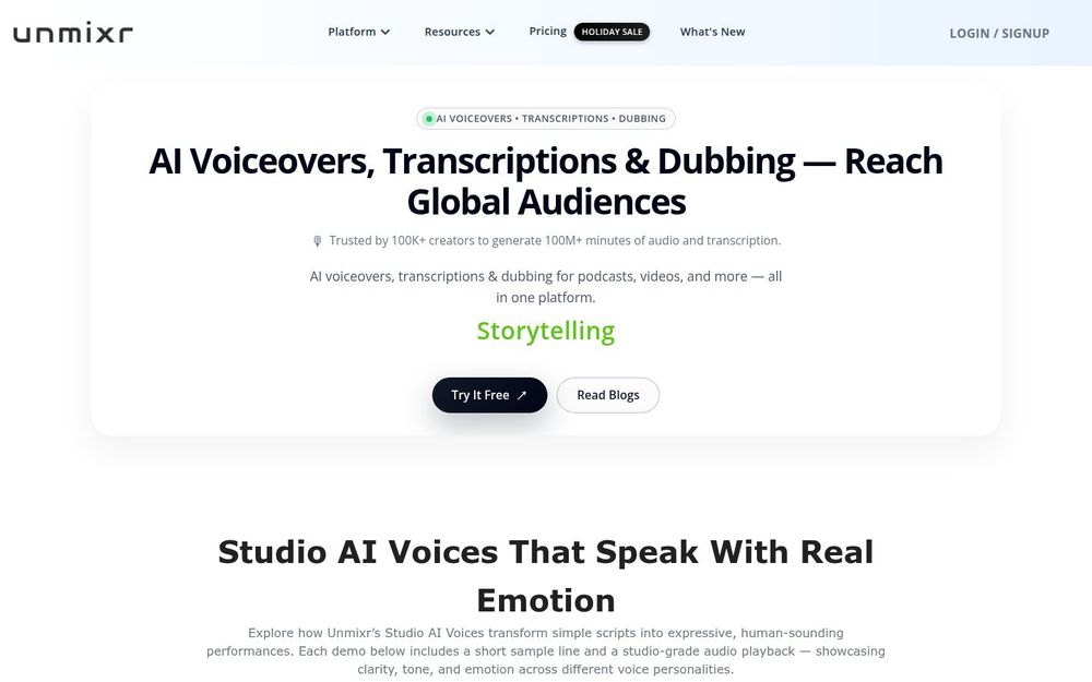 Unmixr 是一款面向创作者、教育者、记者与视频制作团队的全能 AI 语音平台,旨在用最少的人力时间产出专业级的语音内容。平台集合 文本转语音(TTS)、自动转录(STT) 与视频配音与翻译 的完整工作流,支持多语种、多角色与情感表达,使用户能快速将文字、音频或视频转化为可发布的多语言音频内容。官方数据表明平台拥有大量活跃用户与海量生成时长,适合从单人创作者到企业级项目的不同需求。
