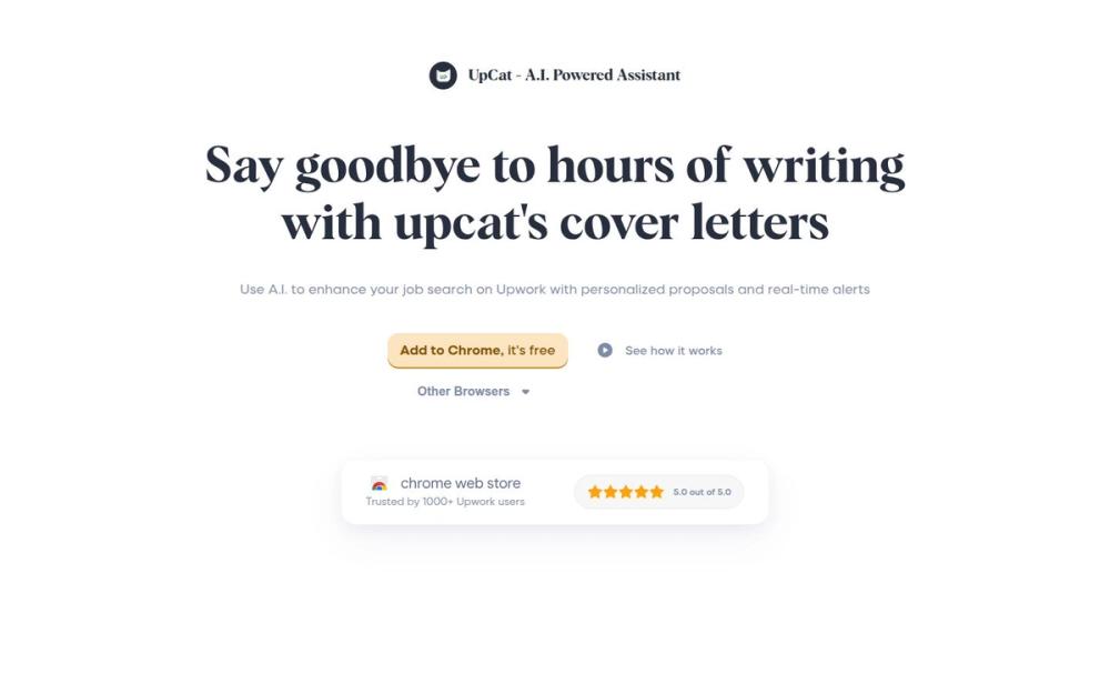 UpCat 适合希望在 Upwork 上提高响应速度与提案质量的用户,尤其是希望减少写作时间、提高中标率的自由职业者。它将 AI 写作、实时提醒 与 多浏览器支持 整合在一起,降低了技术门槛,能够让用户专注于业务与沟通,而非反复构思求职信。对于想要快速扩展投标数量并保持内容质量的人而言,UpCat 是一种便捷且成本低的辅助工具。