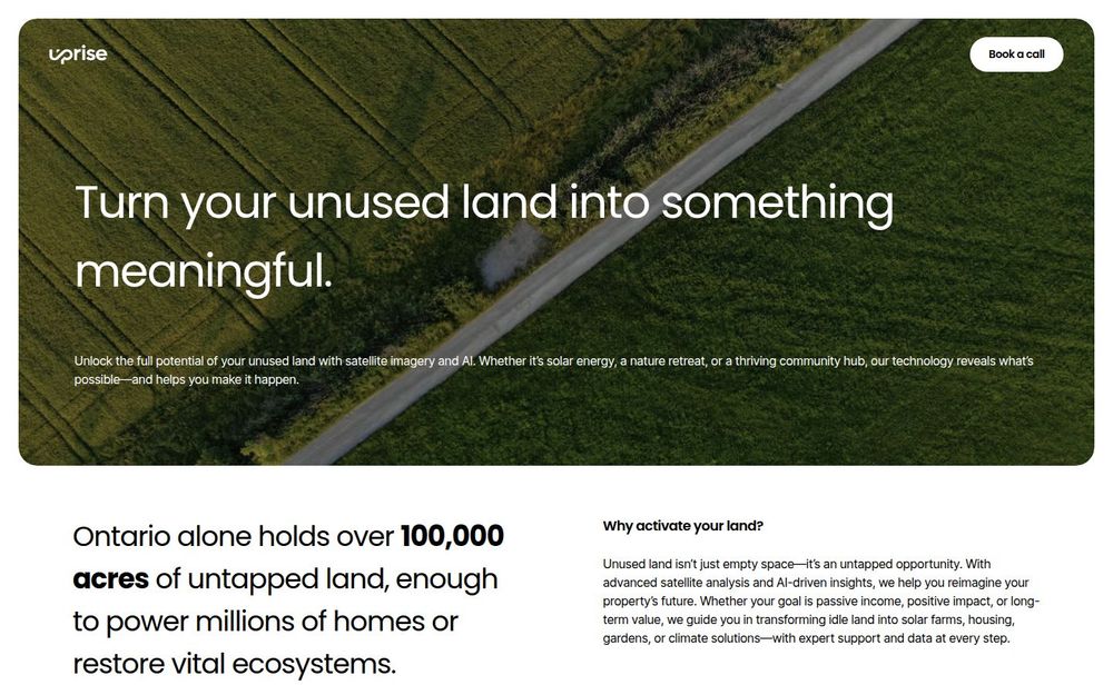 Uprise 是一家专注于将闲置土地转化为可持续价值的科技公司,核心依托卫星影像与人工智能技术,为土地所有者、政府机构、投资者和社区组织提供从评估到实施的全流程服务。其服务旨在通过数据分析识别最优利用方式(如可再生能源、可负担住房、生态休闲等),并在项目设计、法规合规与长期管理方面提供实操支持,从而实现经济、社会与环境效益的平衡。