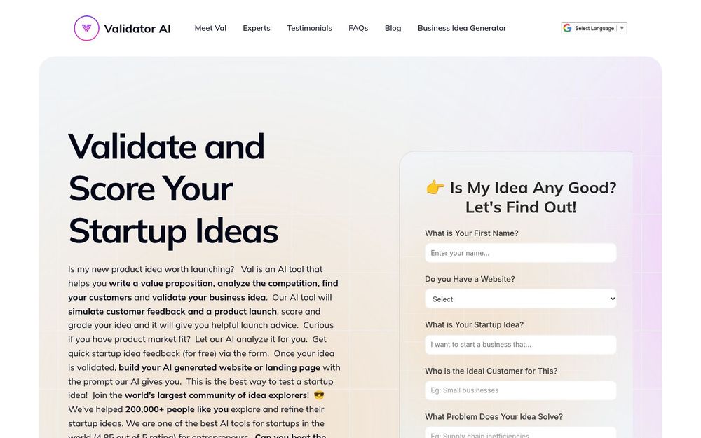 ValidatorAI(简称 Val)是一款以 AI 驱动的创业验证与启动顾问 为核心的在线工具,面向有创业点子或早期产品的创始人。它结合实时市场调研与启动模式模拟,帮助用户判断想法的可行性、明确目标客户并生成可执行的下一步计划。服务强调快速、可复现且具有实操性的建议,目标是让创业者在短时间内获得清晰的商业路径与启动资产。