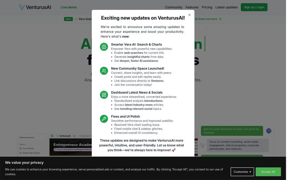 仪表盘、协作与社区: 提供集中仪表盘查看最新分析、行业资讯与社交动向;带有社区空间供用户交流、链接讨论到具体项目(Ventures),支持团队协作与知识沉淀。