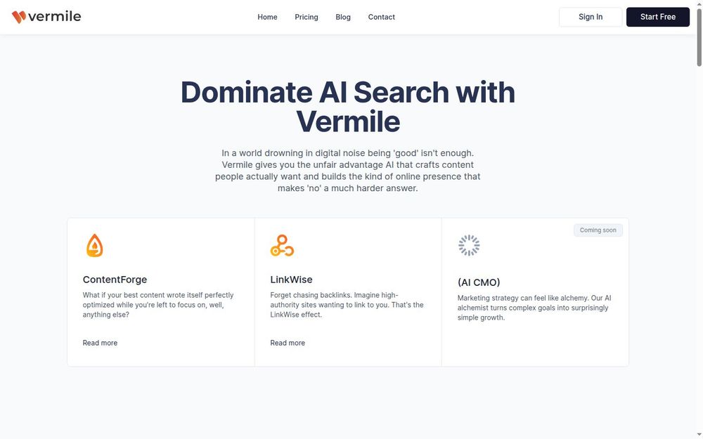 Vermile 不仅仅是一个内容生成工具,它是一个全面的数字营销解决方案。通过结合 AI 技术和人性化的设计,Vermile 帮助用户在竞争激烈的市场中脱颖而出。无论是内容创作、链接建设还是 SEO 优化,Vermile 都能提供有效的支持,帮助用户实现更高的投资回报率。