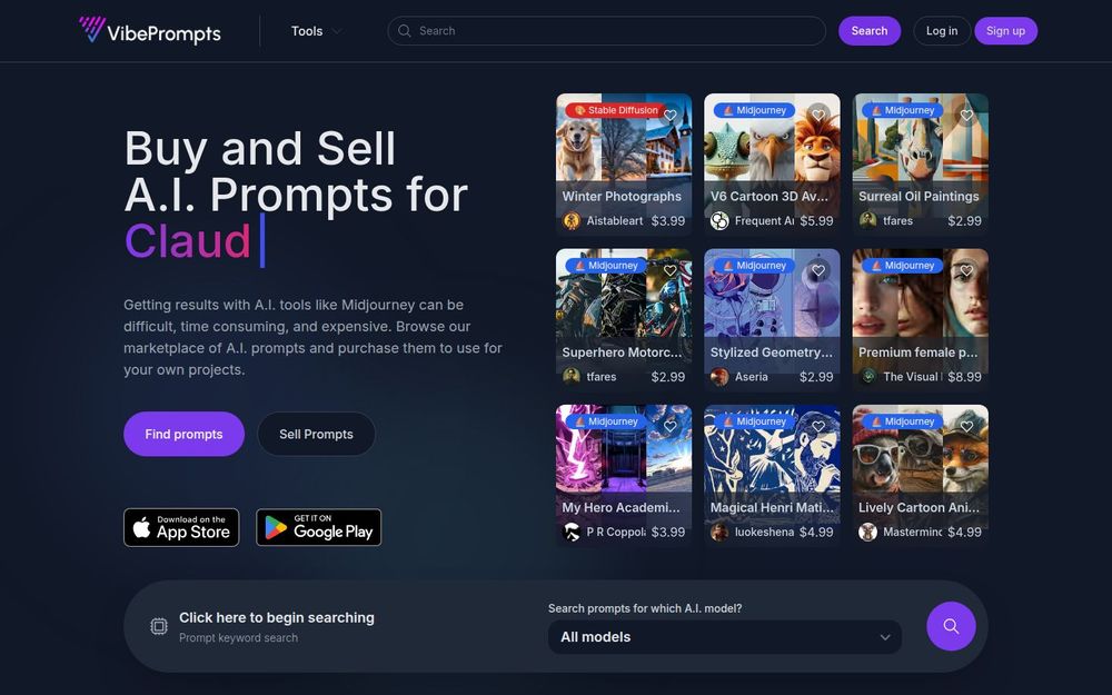VibePrompts 是一个面向创意与实务用户的 A.I. 提示(prompt)交易市场,允许创作者将针对不同模型(例如 Midjourney、Stable Diffusion、GPT、Claude、Gemini 等)的提示上架销售,也允许买家按需购买并直接在自己项目中使用。平台以可视化预览、模型标签和价格体系为基础,提供便捷的浏览、搜索与购买流程,同时支持移动端应用以增强随时调用的便利性。