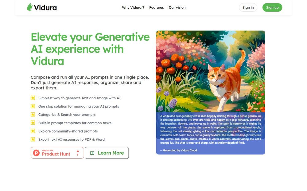 如果你经常与生成式 AI 进行反复试验、需要保存并对比多次生成结果,或者希望在团队间安全共享可复用的提示,Vidura 提供了一套集成化的解决方案。它不仅帮助个人用户提高提示工程效率,也为团队提供权限管理、实验审计与社区学习的闭环。对于追求可复现性、协作性和易用性的用户与组织,Vidura 是一个值得尝试的工具。