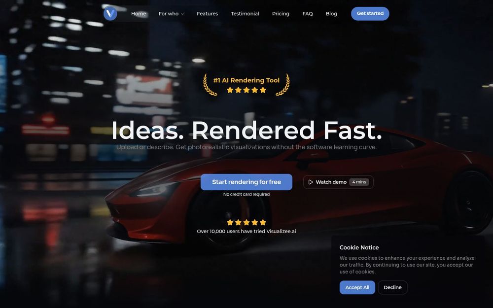 Visualizee 是一款专注于建筑与设计可视化的 AI 渲染平台,旨在帮助专业人士和创作者把概念、草图或低细节模型快速转化为照片级渲染或动态演示。平台主打“零学习曲线”的体验,用直观的聊天式交互和一键生成功能降低创作门槛,同时保留高分辨率输出与商业使用许可,适合从独立创作者到设计工作室的多种需求。