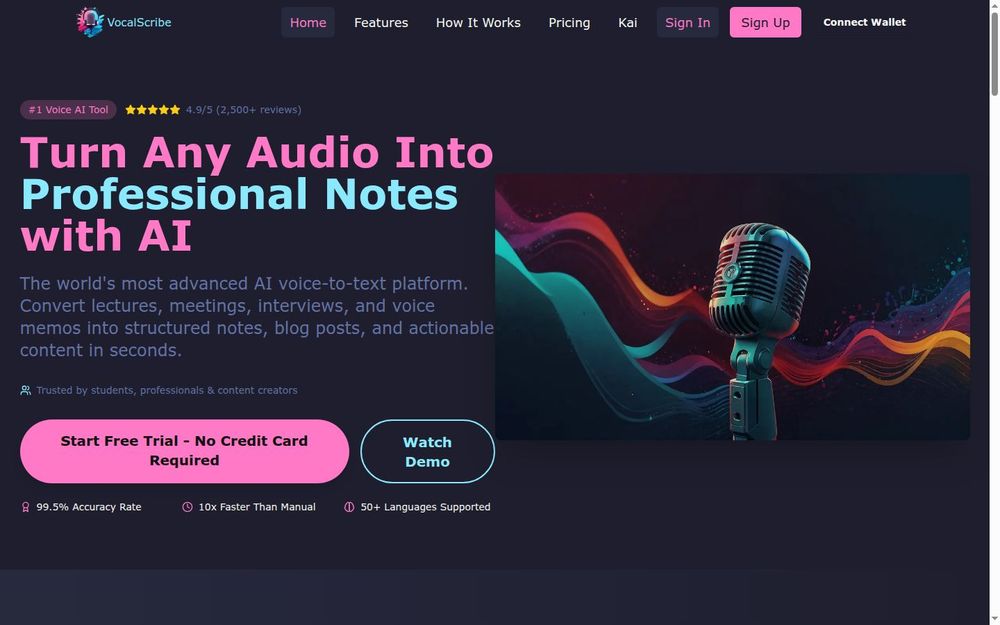 - 99.5% 转录准确率: VocalScribe 采用行业领先的 AI 模型,经过超过 100 万小时的音频训练,确保转录的高准确性,远超其他竞争对手。