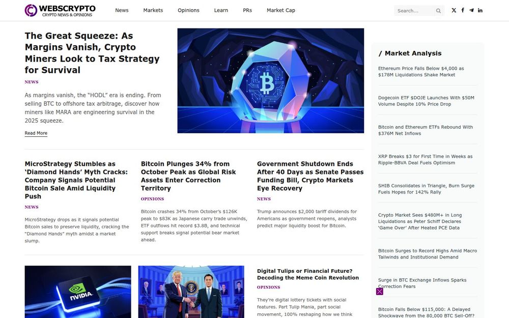 WebsCrypto 是一家聚焦加密货币与区块链领域的新闻媒体平台,旨在为读者提供及时新闻报道、市场行情跟踪、深度观点分析与行业教育内容。网站结构清晰,包含 News、Markets、Opinions、Learn、PRs(新闻稿)和 Market Cap(市值/价格数据)等主要栏目,文章以图文并茂的形式呈现,并配有社交分享和站内搜索,方便用户快速查找感兴趣的主题与最新动态。