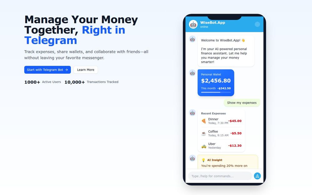 WiseBot 是一款直接在 Telegram 中运行的个人理财与协作记账机器人,旨在让用户无需安装额外应用即可完成日常记账、共享钱包与智能分析。它把传统记账工具的功能带入即时通讯环境,方便随时记录、查看与分享账目,适合个人、家庭与小团队使用。