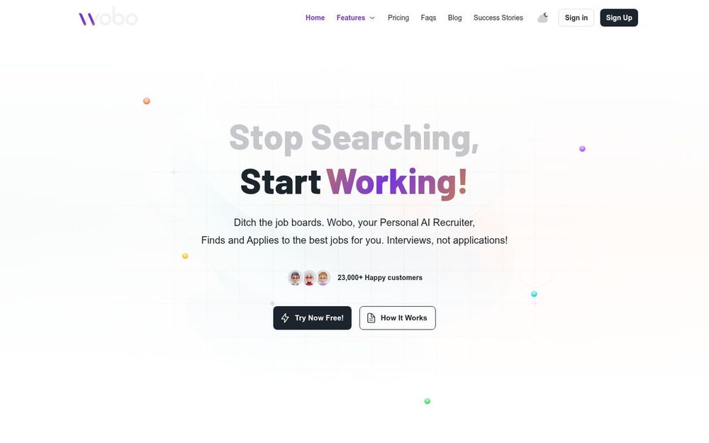 Wobo 是一款以 AI 为核心的“个人招聘助理”,通过自动化申请流程和个性化求职画像(Wobo Persona),替用户在全市场范围内发现并申请合适职位。平台主张“Stop Searching, Start Working”,目标是把求职者从繁琐的简历投递和海量职位筛选中解放出来,让用户把时间用于准备面试和职业规划。