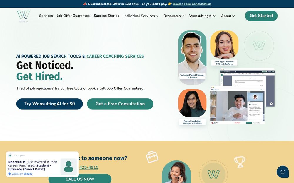 Wonsulting 同时提供一对一的职业咨询服务,包含 简历修改、LinkedIn 优化、求职策略、全程代投与面试准备 等。平台宣称有 1.5M+ WonsultingAI 用户、数千个成功录用案例,并提供“120 天内获得聘用否则不付费”的服务保障,增强用户信心。