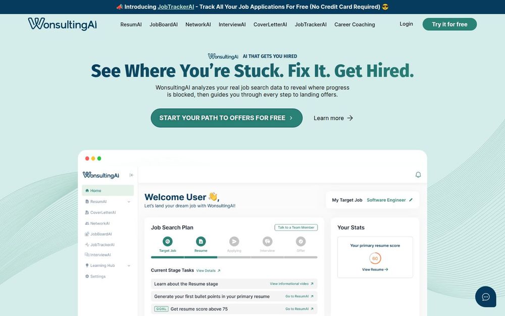 WonsultingAI 是一款面向求职全流程的人工智能工具集,目标是通过数据驱动的分析与自动化产出,帮助用户提高简历命中率、增加面试机会并最终拿到 offer。平台将简历优化、求职信撰写、个性化社交拓展、职位匹配、申请跟踪与面试演练整合为一条可视化的求职路径,支持免费入门和付费升级。