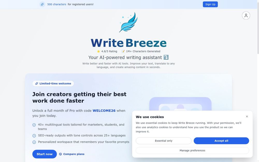 平台提供分级使用权限:访客试用有字数限制,注册用户与付费会员可获得更高的请求额度与高级工具访问。网站也使用 cookies(包含必要与分析类)以保障服务运行与产品改进。总体而言,Write Breeze 将多样化的写作功能集合于一处,既适合个人高效写作,也方便团队规模化内容生产。