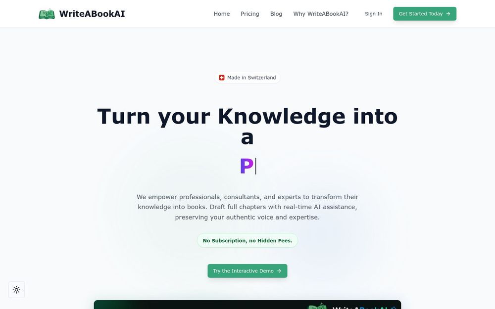 WriteABookAI 是一款专为有专业知识但缺乏写作时间或写作经验的从业者设计的 AI 写书平台。它把复杂的书籍创作过程拆解为可执行的步骤:定义受众、生成智能大纲、AI 辅助写章、以及导出出版准备文件。平台主打人机协作,AI 提供结构与文字支持,作者保留对内容与语气的最终控制。
