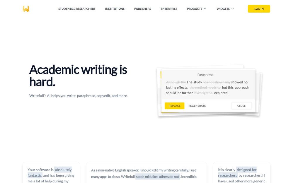 Writefull 是面向学术写作者的语言增强平台,旨在通过人工智能技术提升论文和科研文本的语言质量与表达效率。它将专门为学术场景调整的语言模型与多种写作小工具(widgets)结合,既能在写作环境内实时给出语言反馈,也能独立生成摘要、标题和 LaTeX 代码,满足从句子级润色到整段生成的多种需求。