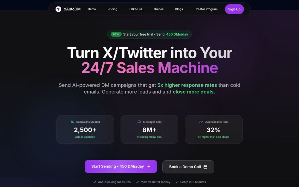 xAutoDM 是一款专注于将 X/ Twitter 私信自动化和智能化的获客工具。它结合AI 个性化消息生成、大规模线索抓取与实时效果分析,将冷启动私信变成可规模化、可测量的销售渠道。平台主打“设置 2 分钟上手、24/7 自动化运作、并且尽量降低账号风险”的使用体验,适合想用社交私信获取客户的个人和团队。