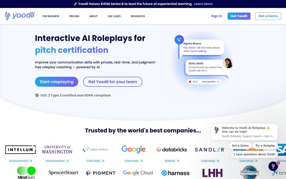 Yoodli 是一款专注于提升沟通与演讲能力的 AI 角色扮演平台,通过近似真实场景的模拟与持续训练,帮助个人与团队在关键时刻表现更佳。用户可以在私密、无评判的环境中反复练习,通过即时反馈与数据驱动的洞察,逐步优化开场、发现问题、回应异议和闭环陈述等关键环节。平台既服务于个人学习者,也为企业提供可扩展的培训与认证解决方案。