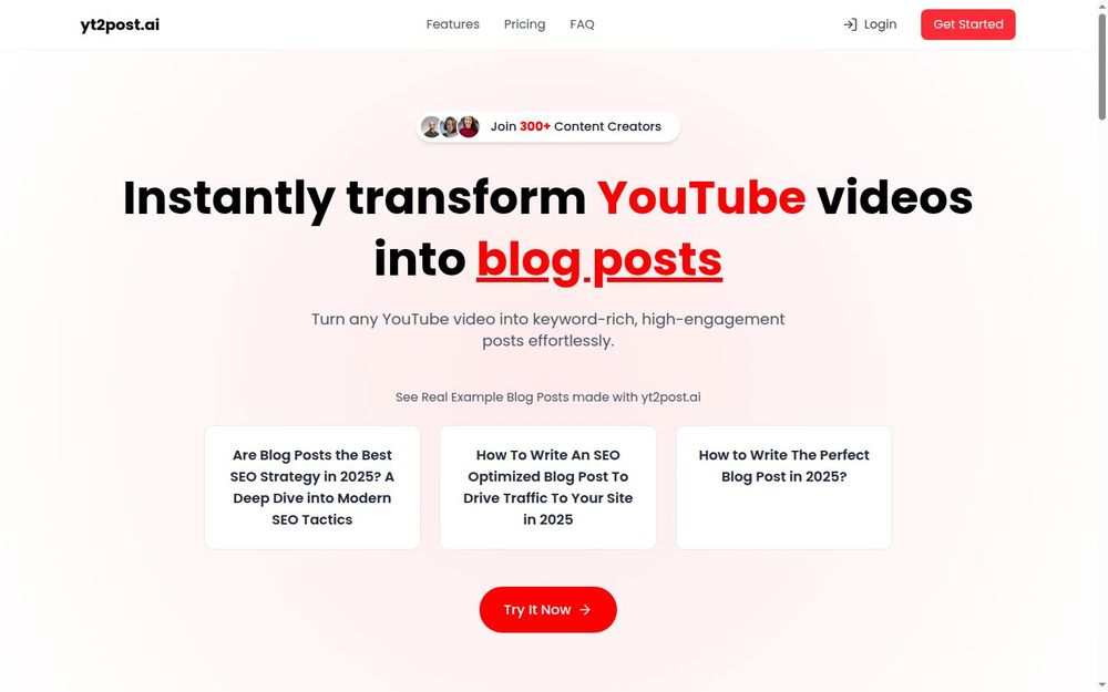 yt2post.ai 不仅节省了内容创作的时间,还提高了内容的质量和参与度。无论是个人创作者还是团队,使用该平台都能显著提升工作效率。加入 300 多名创作者的行列,体验内容创作的革命性变化。