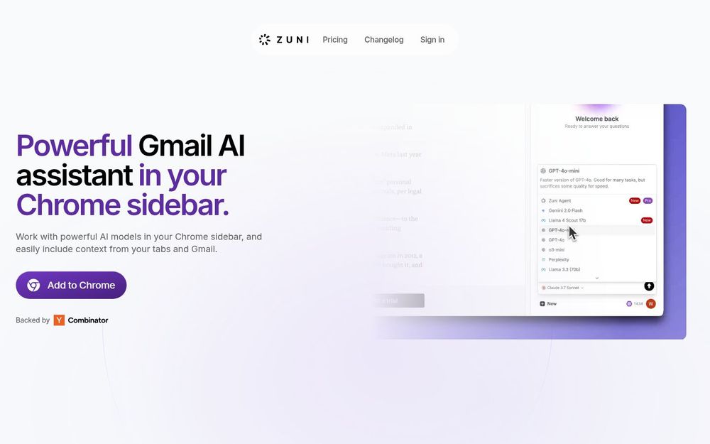 Zuni 是一款将强大 AI 功能直接带入浏览器侧边栏的工具,重点面向需要高效处理邮件和网页信息的用户。通过 Chrome 扩展安装后,Zuni 能跨标签页读取内容、接入多家领先模型,并与 Gmail 深度联动,帮助用户在浏览网页或编写邮件时即时获得智能建议与自动化写作支持。